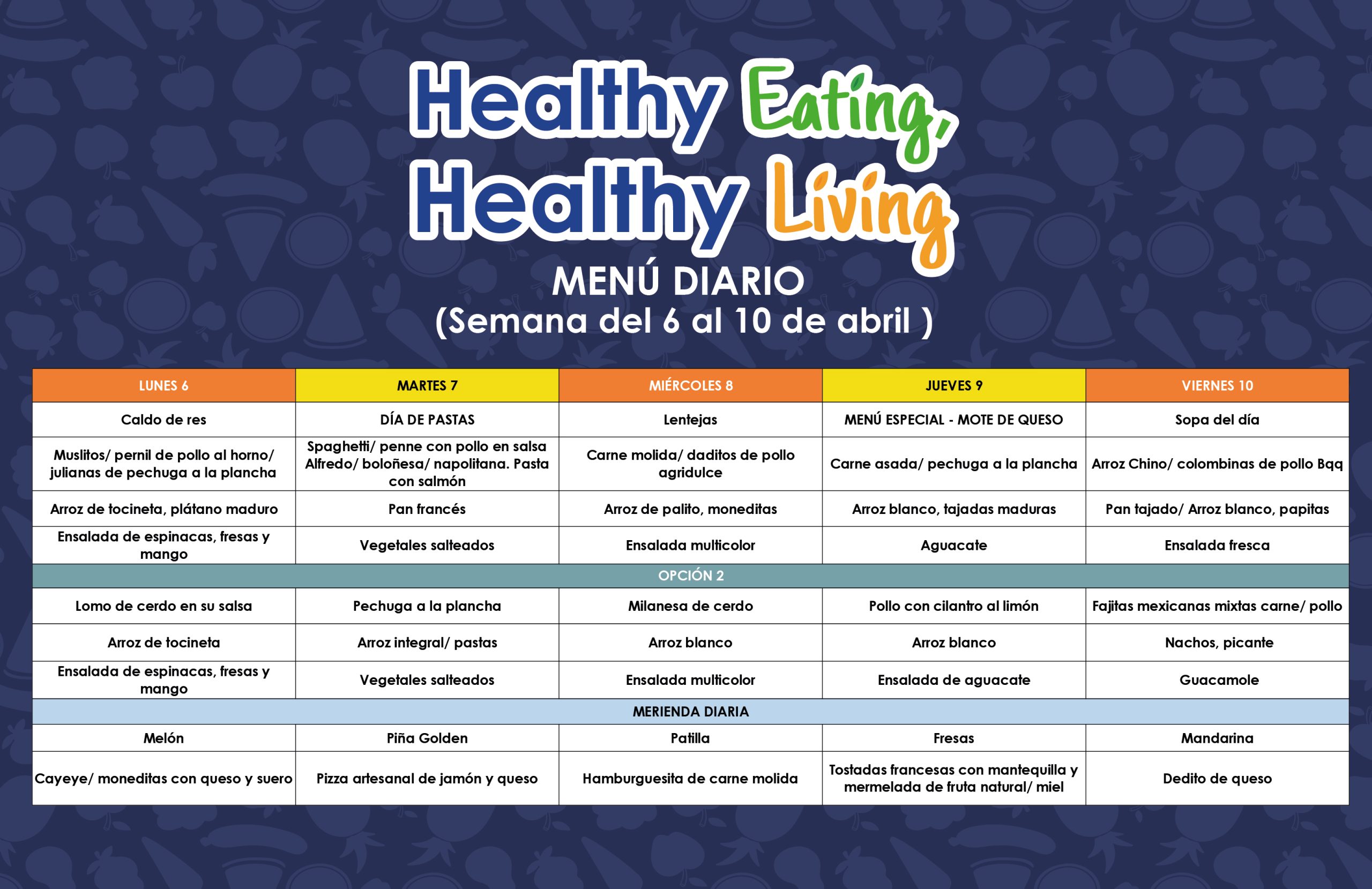 Nuestro menú se actualiza cada viernes con la información de almuerzos (dos opciones) y meriendas que se ofrecerán cada día de la semana a siguiente: