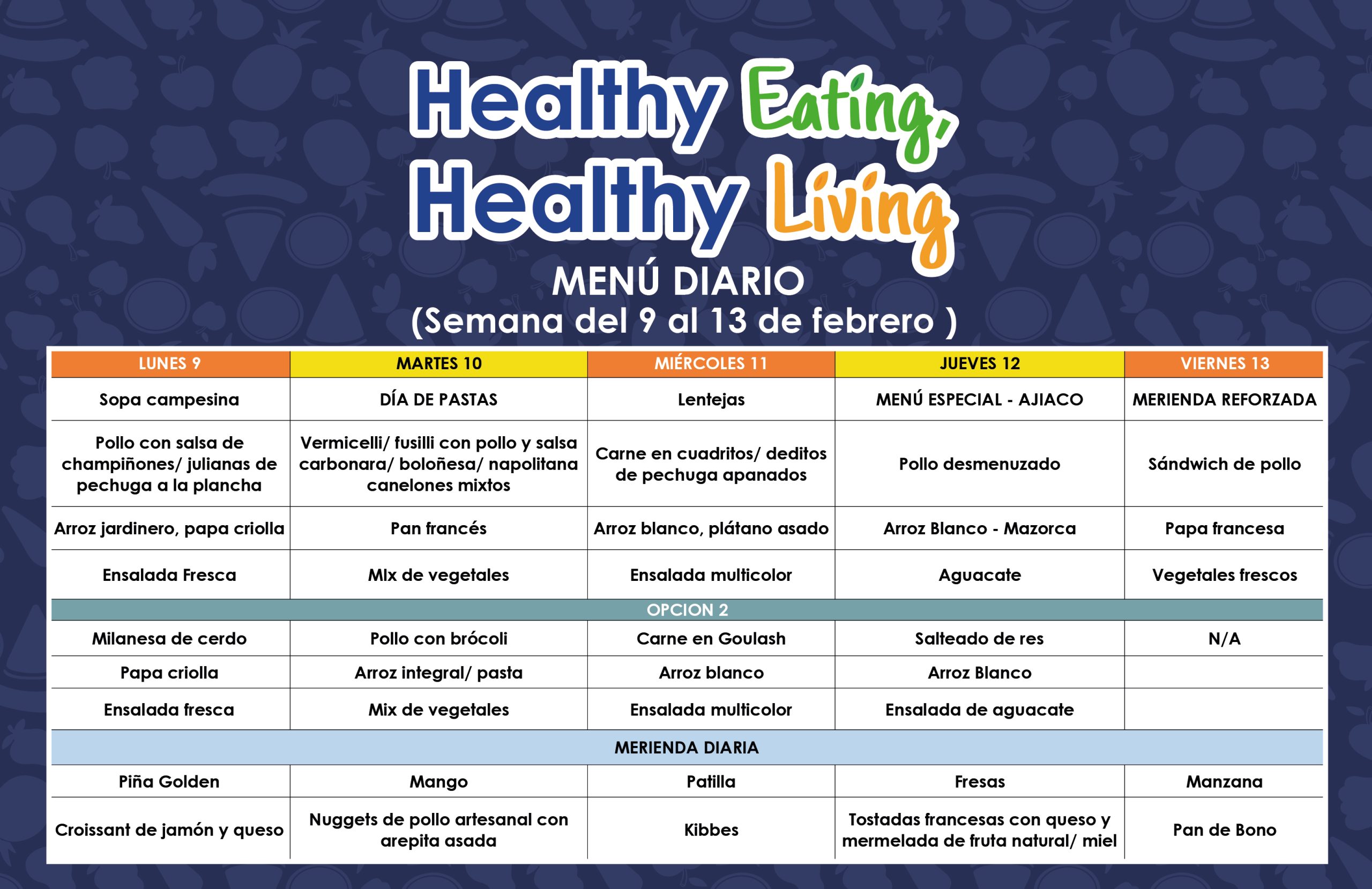 Nuestro menú se actualiza cada viernes con la información de almuerzos (dos opciones) y meriendas que se ofrecerán cada día de la semana a siguiente: